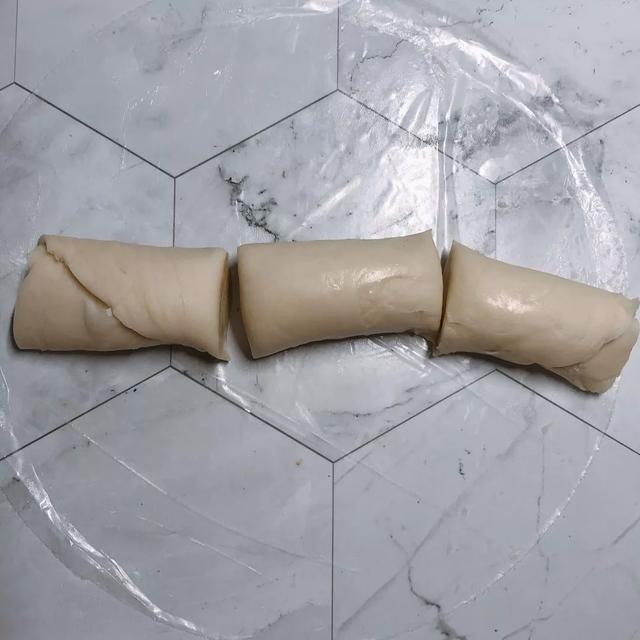 Step2. 将回软的手抓饼沿一边卷起,切成3等份。