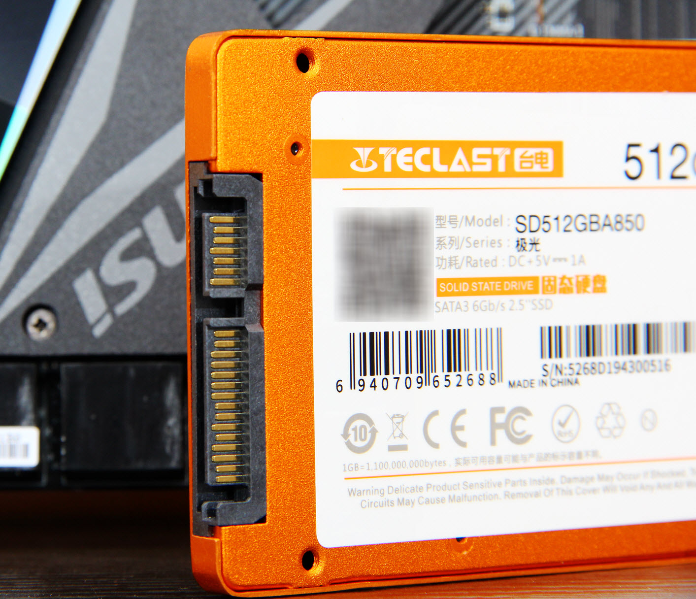 此次测试使用的台电A850 512GB SATA3.0固态的京东售价329实在极具性价比,而到了双11可能还会有惊喜。外包装采用橙黄色为主色调。包装盒背面可以看到固态硬盘主要参数,写着产品型号和生产日期,这款固态硬盘的厚度只有6.9mm,并提供了3年保修的服务,接口规格SATA3.0(6Gb/s)并向下兼容 SATA2.0 (3Gb/s)。